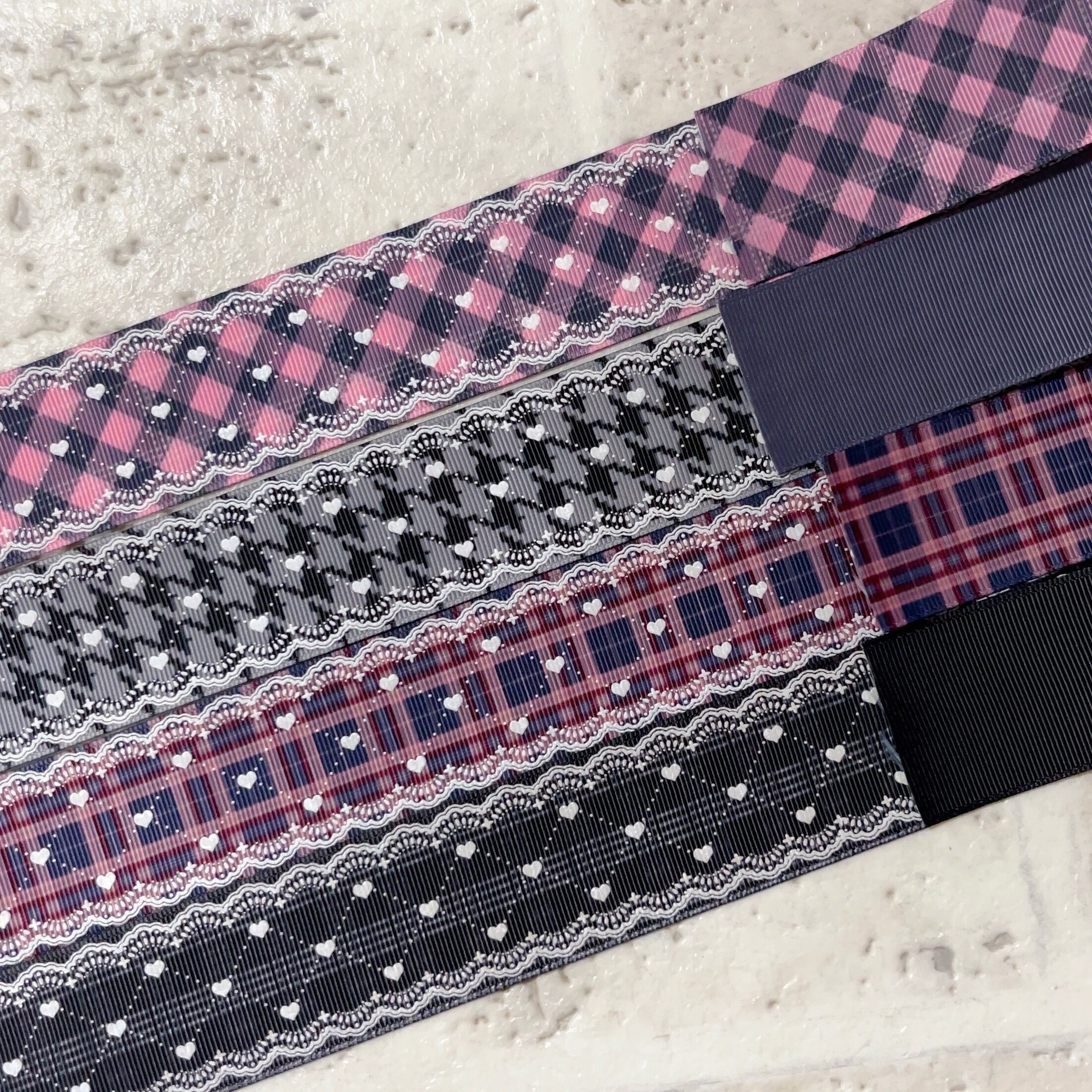 B【8mセット】チェック38mm リバーシブルホワイトホロハートレース柄グログランリボン 4種x2m@8mセット